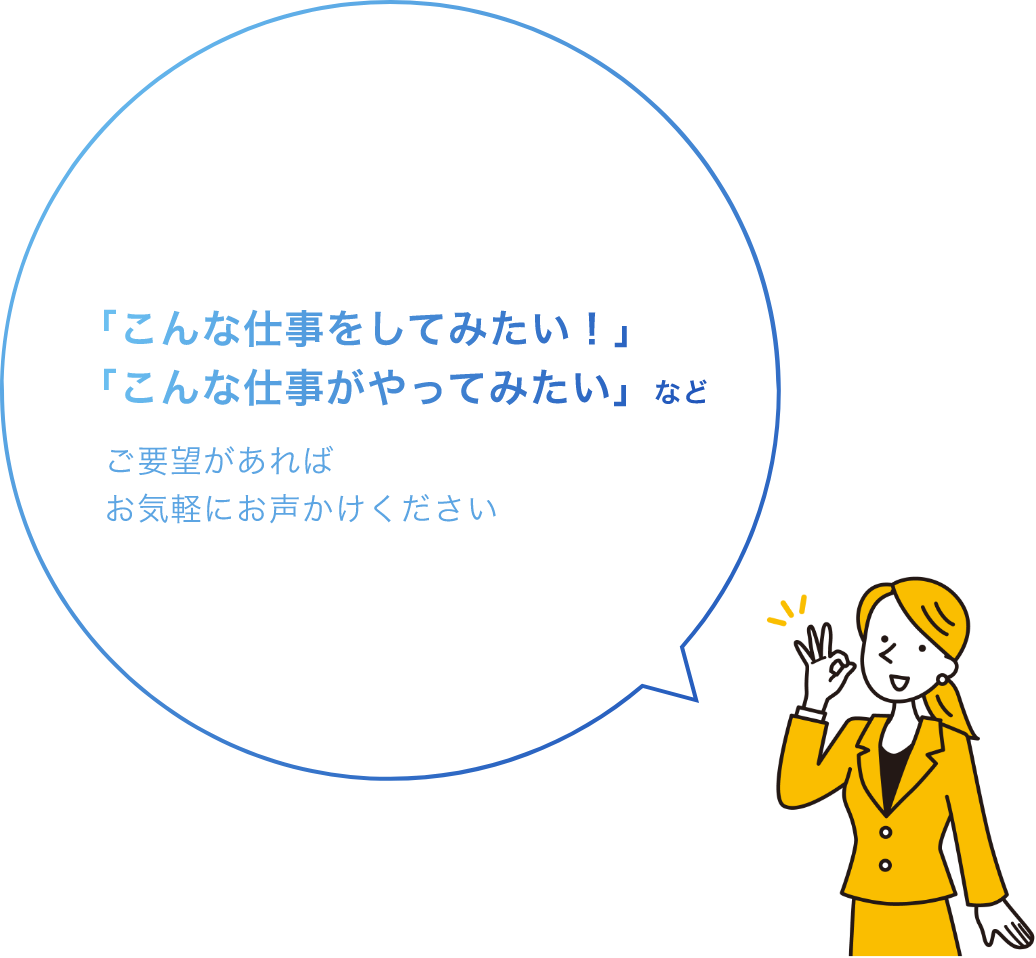 どんな仕事にもチャレンジし、お力になれるよう尽力いたします。